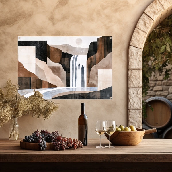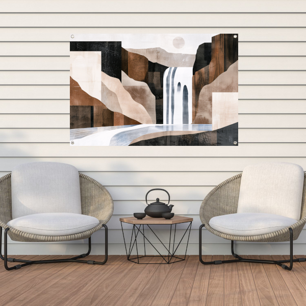 Minimalistische waterval in monochrome aardetinten tuinposter