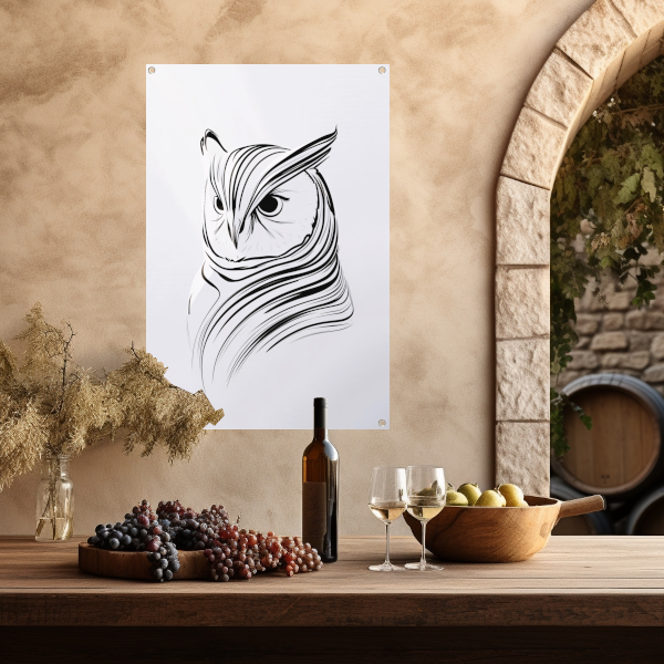 Minimalistische zwart-witte uil lijntekening tuinposter