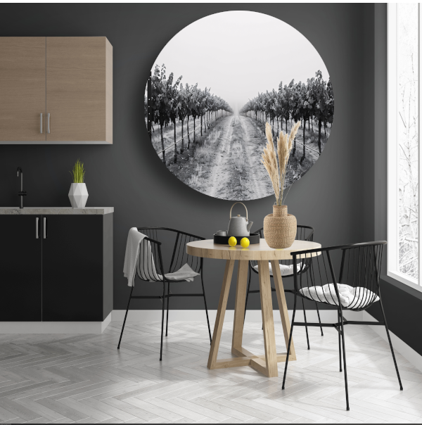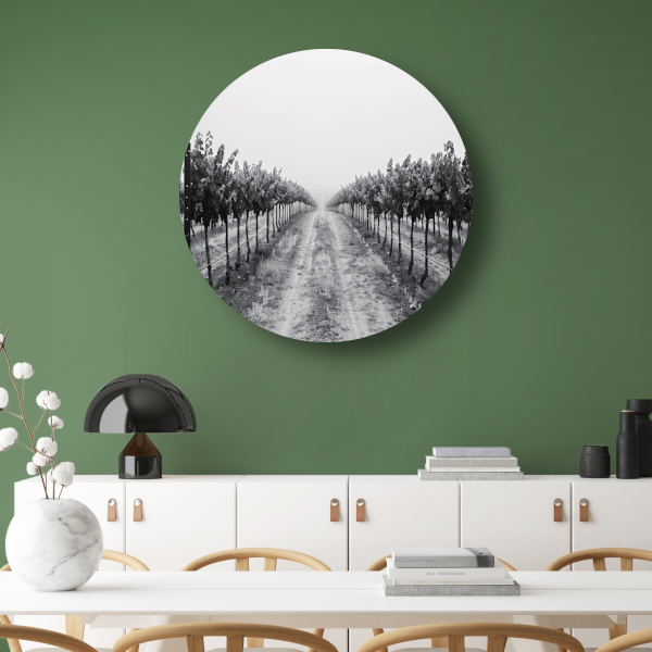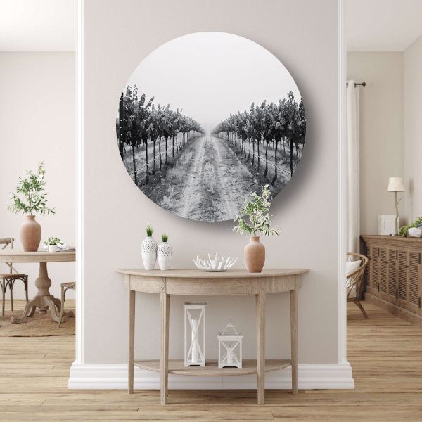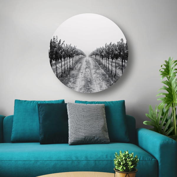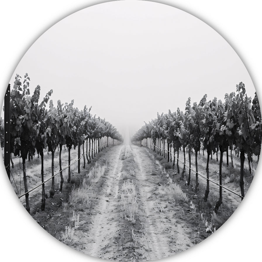 Mistige ochtend in de wijngaard aluminium muurcirkel