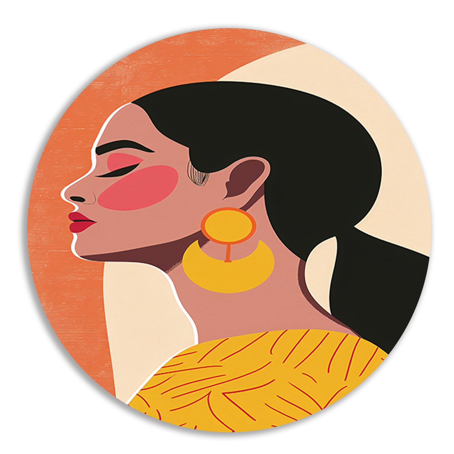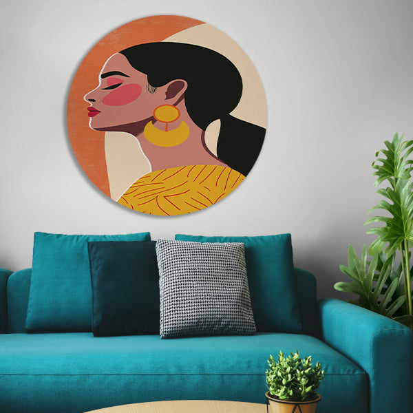 Modern vrouwelijk portret met kleurrijke oorbellen aluminium muurcirkel