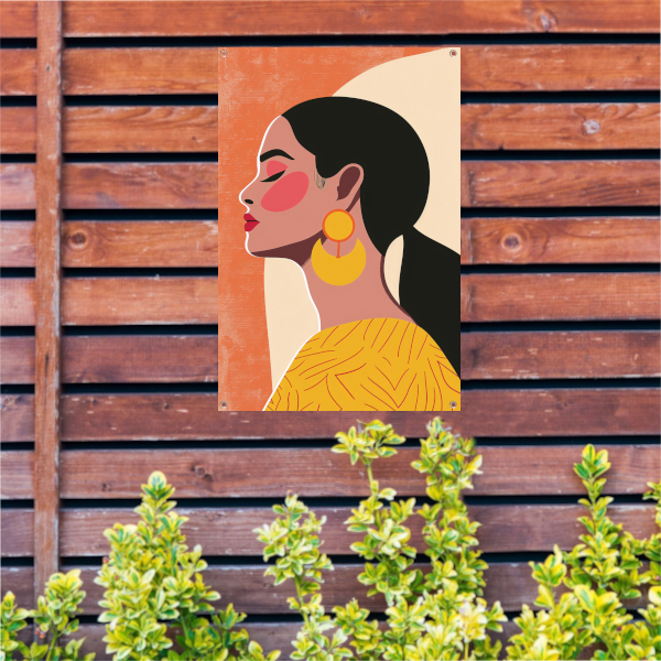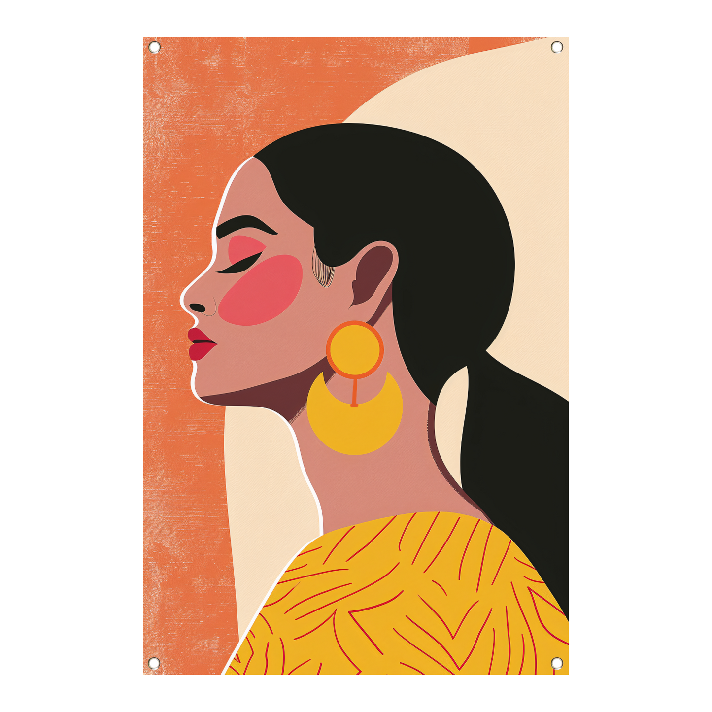 Modern vrouwelijk portret met kleurrijke oorbellen tuinposter