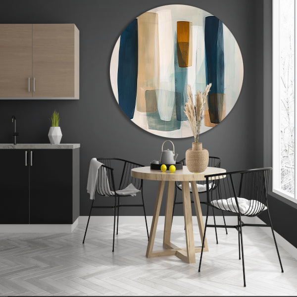Voeg een vleugje kunstzinnigheid toe aan jouw interieur en bestel vandaag nog deze moderne abstracte kunst muurcirkel in aardetinten en blauw aluminium. Maak een statement in jouw ruimte met dit unieke en stijlvolle kunstwerk!