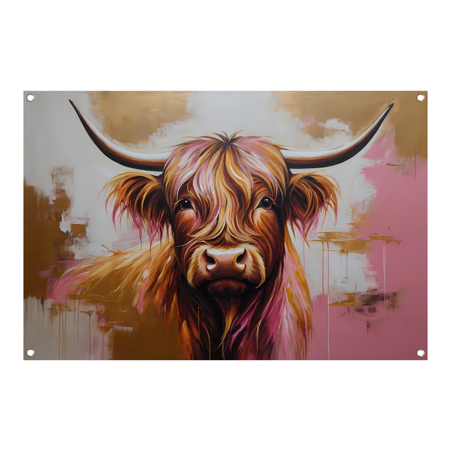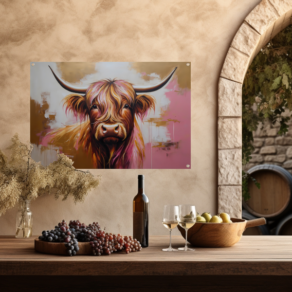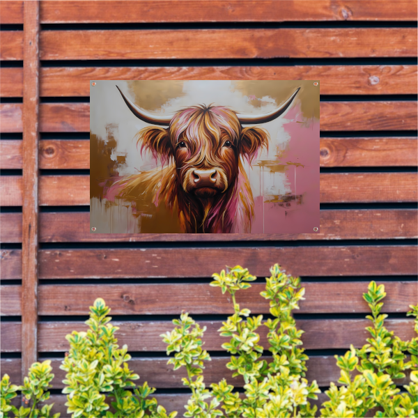 Het thema van deze tuinposter is de prachtige Highland koe, die bekend staat om zijn lange, golvende vacht en imposante hoorns. De koe is afgebeeld in een moderne stijl, met strakke lijnen en gouden tinten die zorgen voor een luxueuze uitstraling.