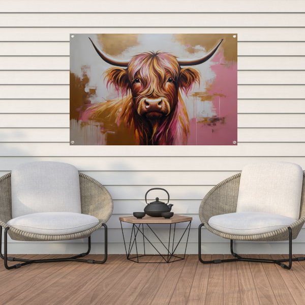 De Moderne Highland Koe in Gouden Tinten tuinposter is een veelzijdig product dat niet alleen geschikt is voor in de tuin, maar ook voor op het balkon, terras of zelfs binnenshuis. Het is een echte eyecatcher die jouw ruimte zal transformeren en voor een unieke sfeer zal zorgen.