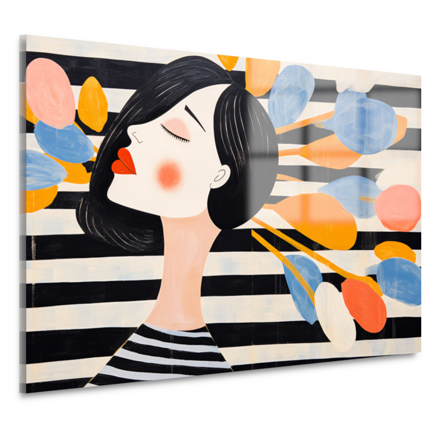 Moderne vrouw omringd door zwevende bloemen acrylglas
