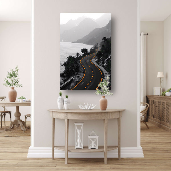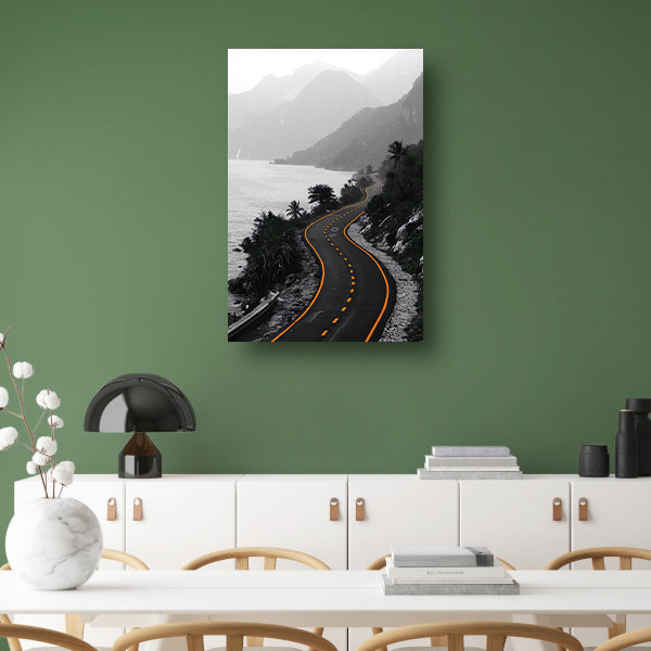 Monochrome weg door berglandschap poster