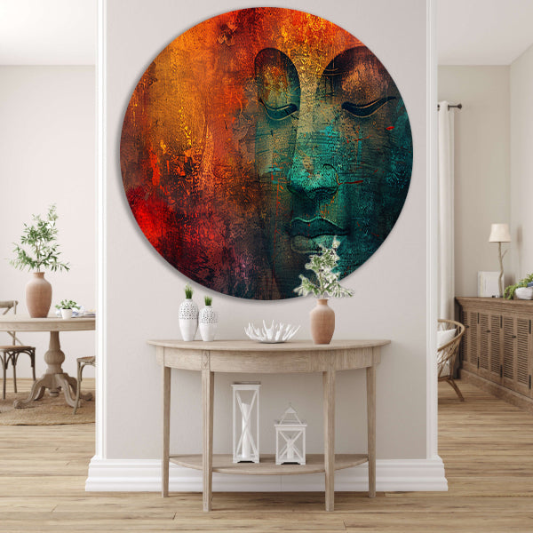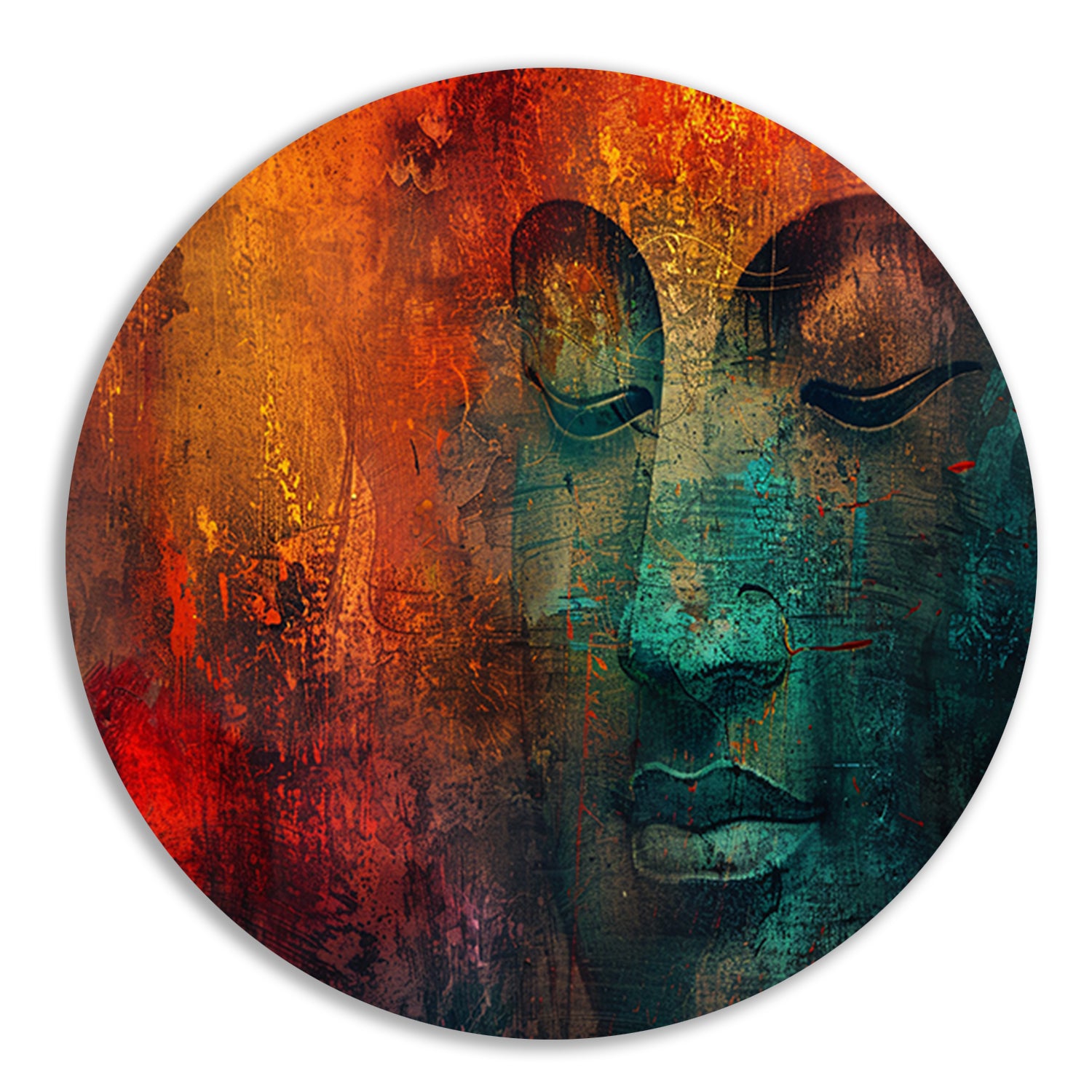 Mysterieus Boeddha portret met kleurrijke texturen aluminium muurcirkel