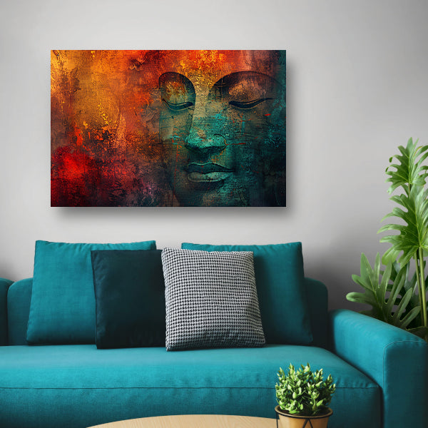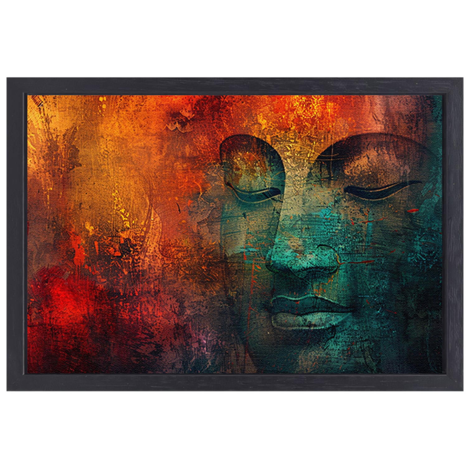 Mysterieus Boeddha portret met kleurrijke texturen canvas met baklijst
