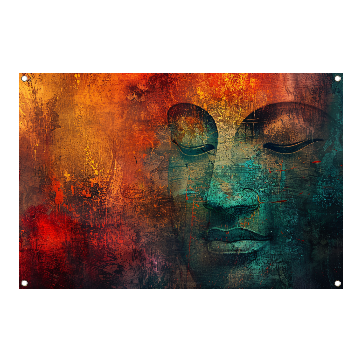 Mysterieus Boeddha portret met kleurrijke texturen tuinposter