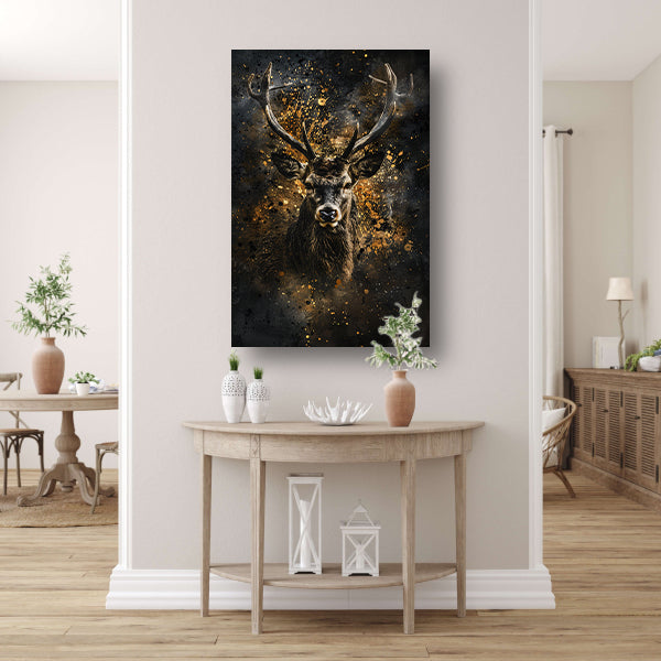 Mysterieus hert met abstracte gouden spatten canvas met baklijst