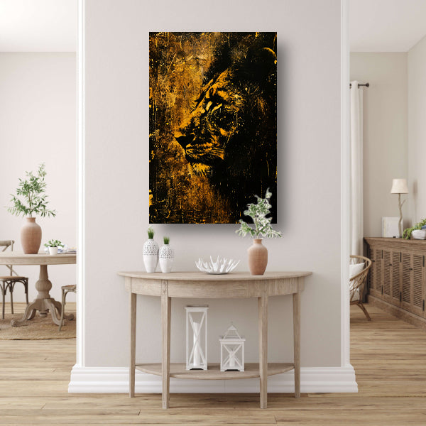 Het leeuwenportret is vervaardigd met oog voor detail en een focus op rustieke elementen. Het canvas heeft een dikte van 1,8 cm, wat niet alleen zorgt voor een stevige constructie, maar ook een luxe uitstraling biedt. De natuurlijke texturen en rijke kleuren van het canvas zijn zorgvuldig geselecteerd om de pracht van het leeuwenkop te accentueren, waardoor een mysterieuze sfeer in uw huis ontstaat.