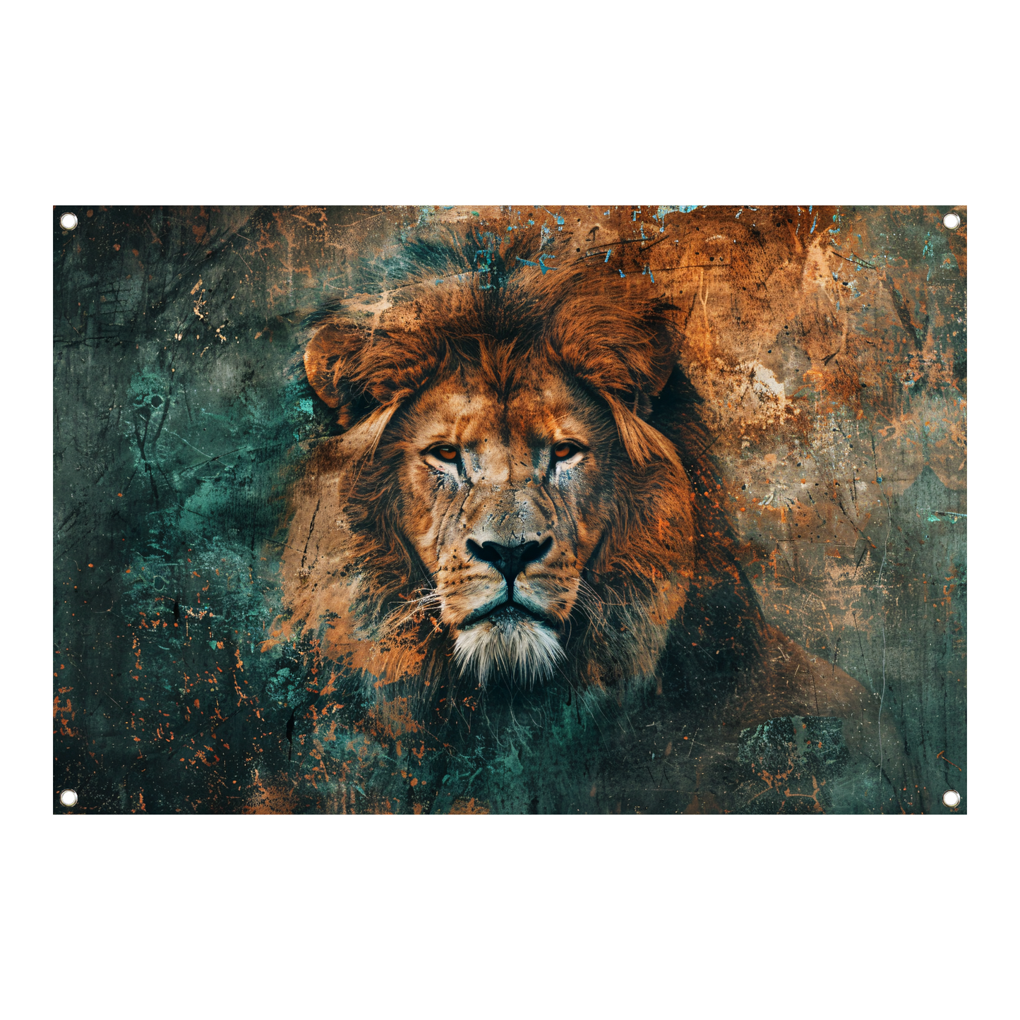 Mysterieus leeuwenportret met abstracte texturen tuinposter