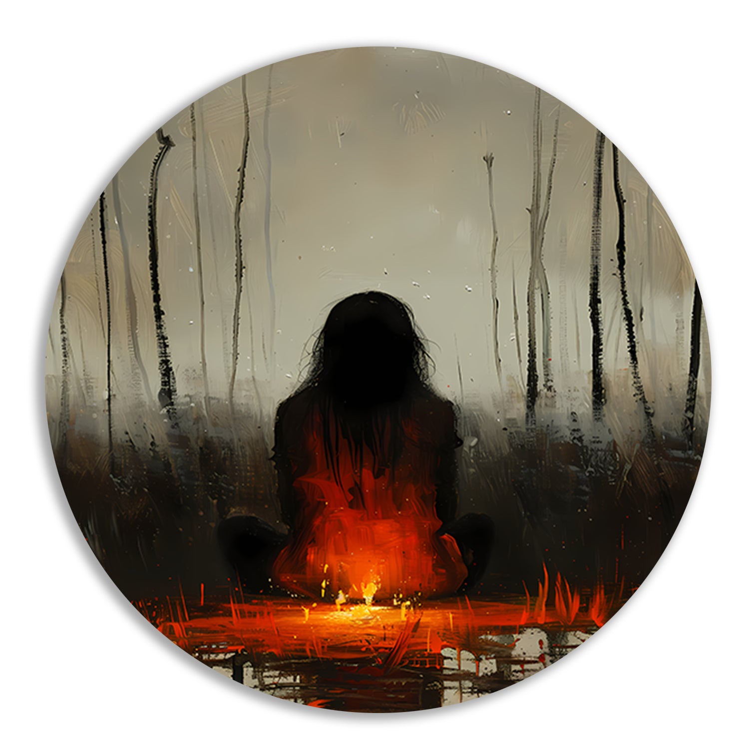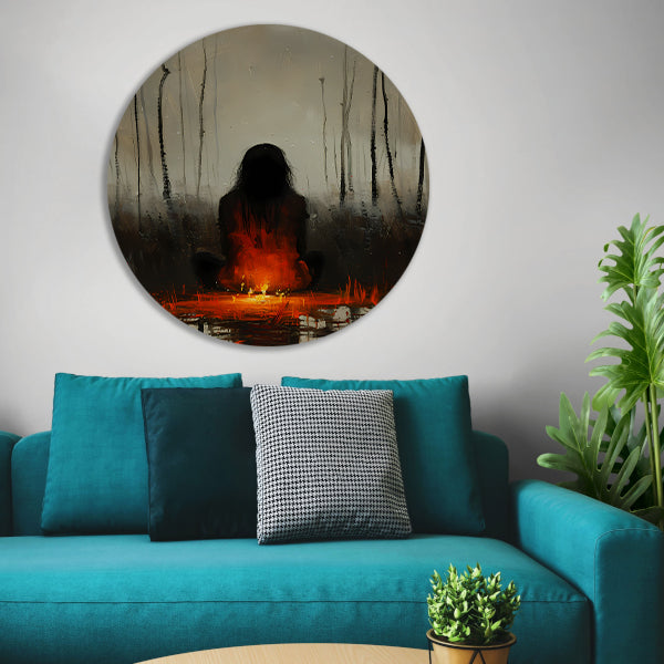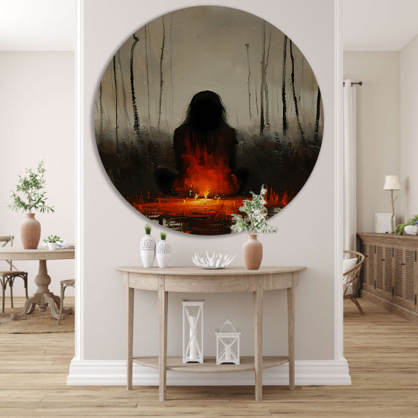 Mysterieus silhouet bij kampvuur in bos aluminium muurcirkel