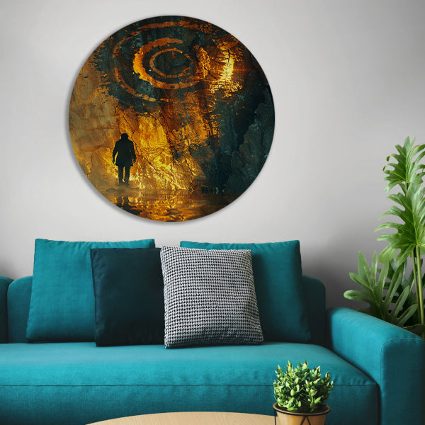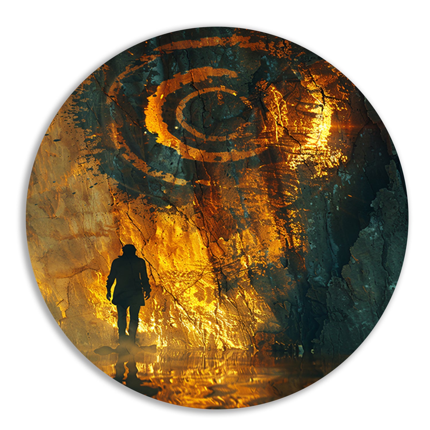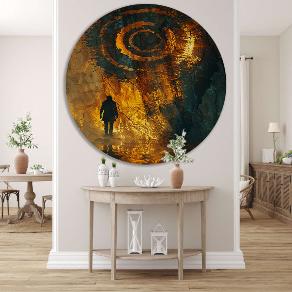 Mysterieuze figuur ontmoet gouden spiraal aluminium muurcirkel
