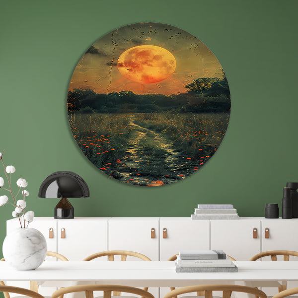 Dit kunstwerk is verkrijgbaar in diverse formaten, waardoor er altijd een optie is die perfect past bij jouw ruimte. Voeg een vleugje mystiek en magie toe aan jouw interieur met deze prachtige muurcirkel van Mystiek Maanlicht Pad Door Bloemenveld.
