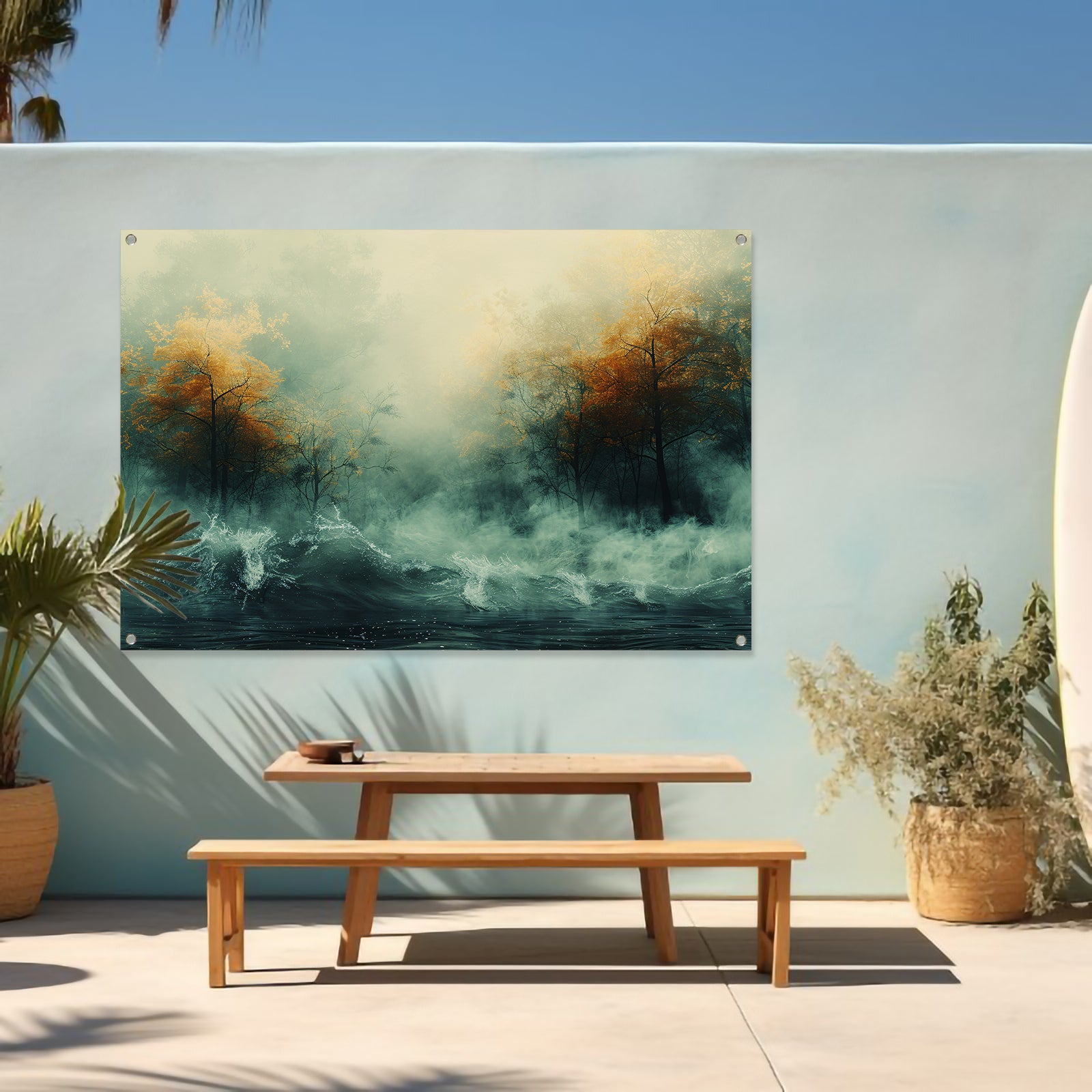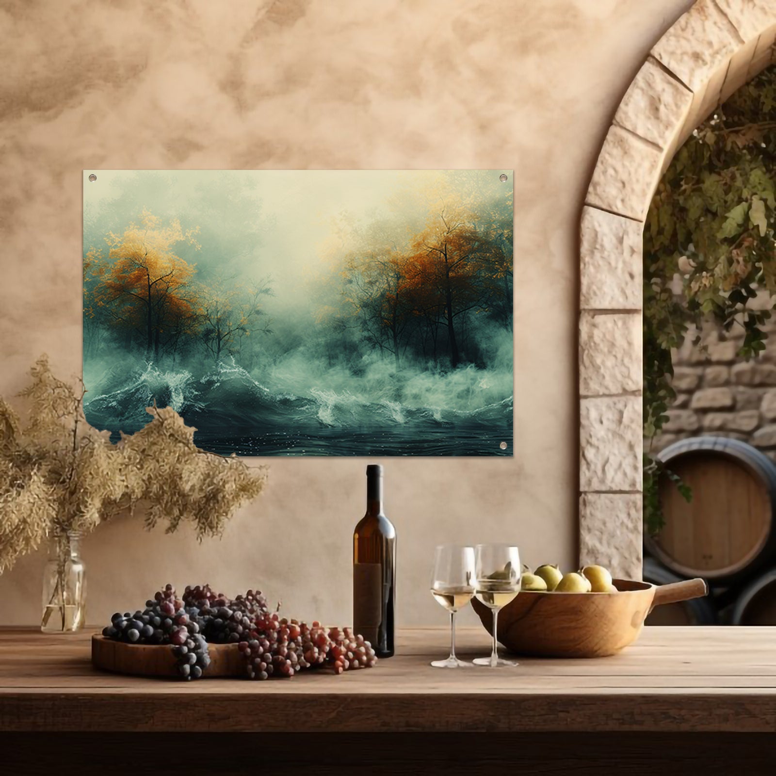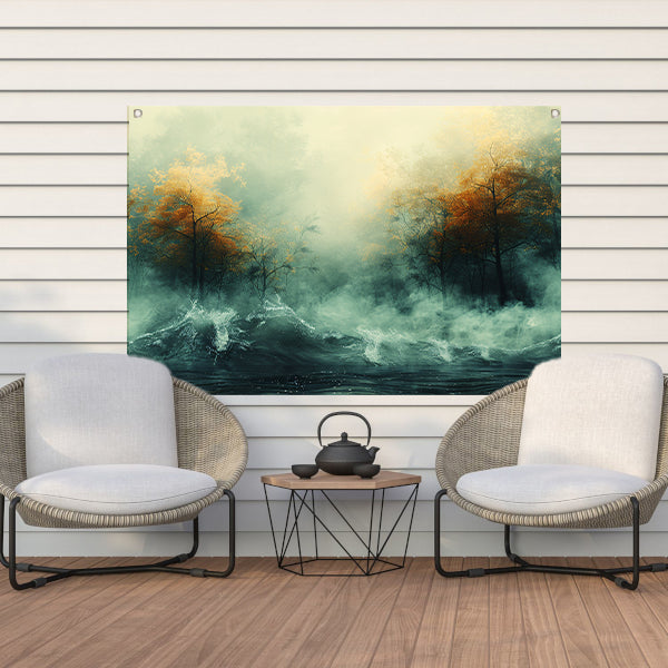 Mystieke herfstbomen boven woelige wateren tuinposter