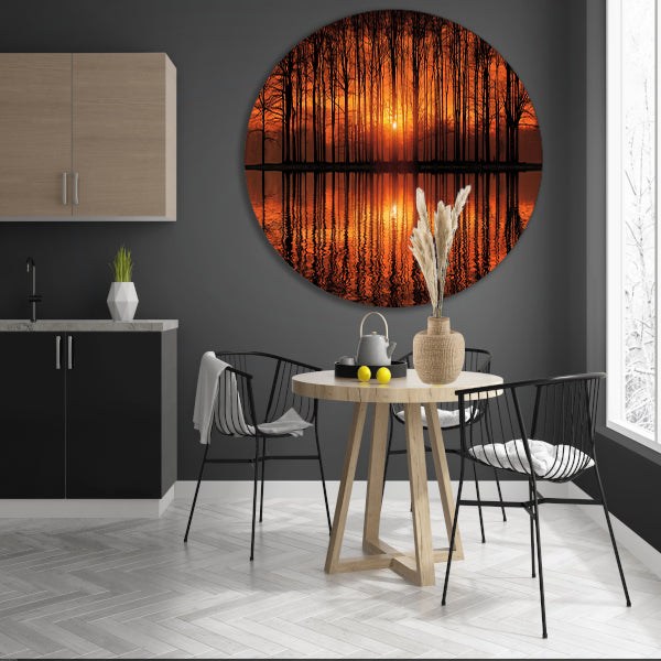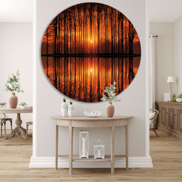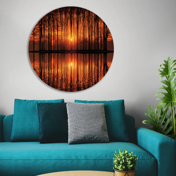 Mystieke zonsondergang in bos bij meer aluminium muurcirkel