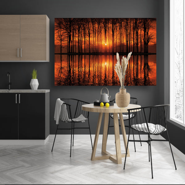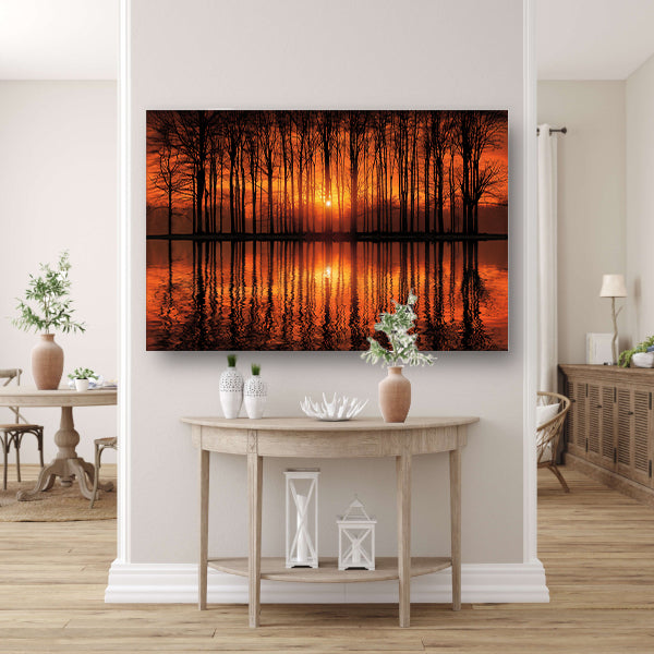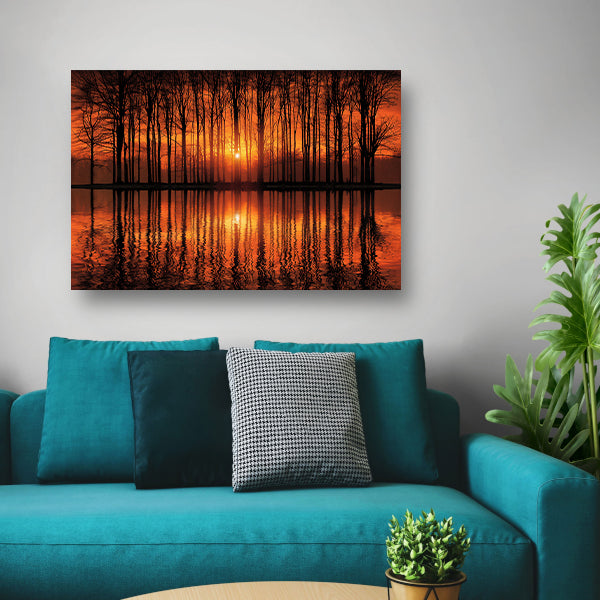 Mystieke zonsondergang in bos bij meer canvas met baklijst