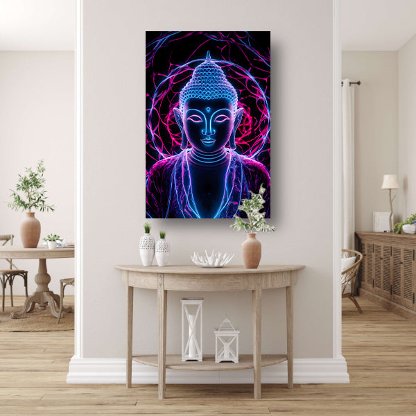 Neon Boeddha met psychedelische kleuren en halo canvas met baklijst