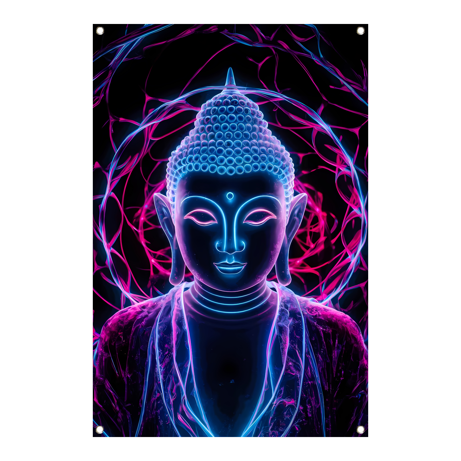 Neon Boeddha met psychedelische kleuren en halo tuinposter