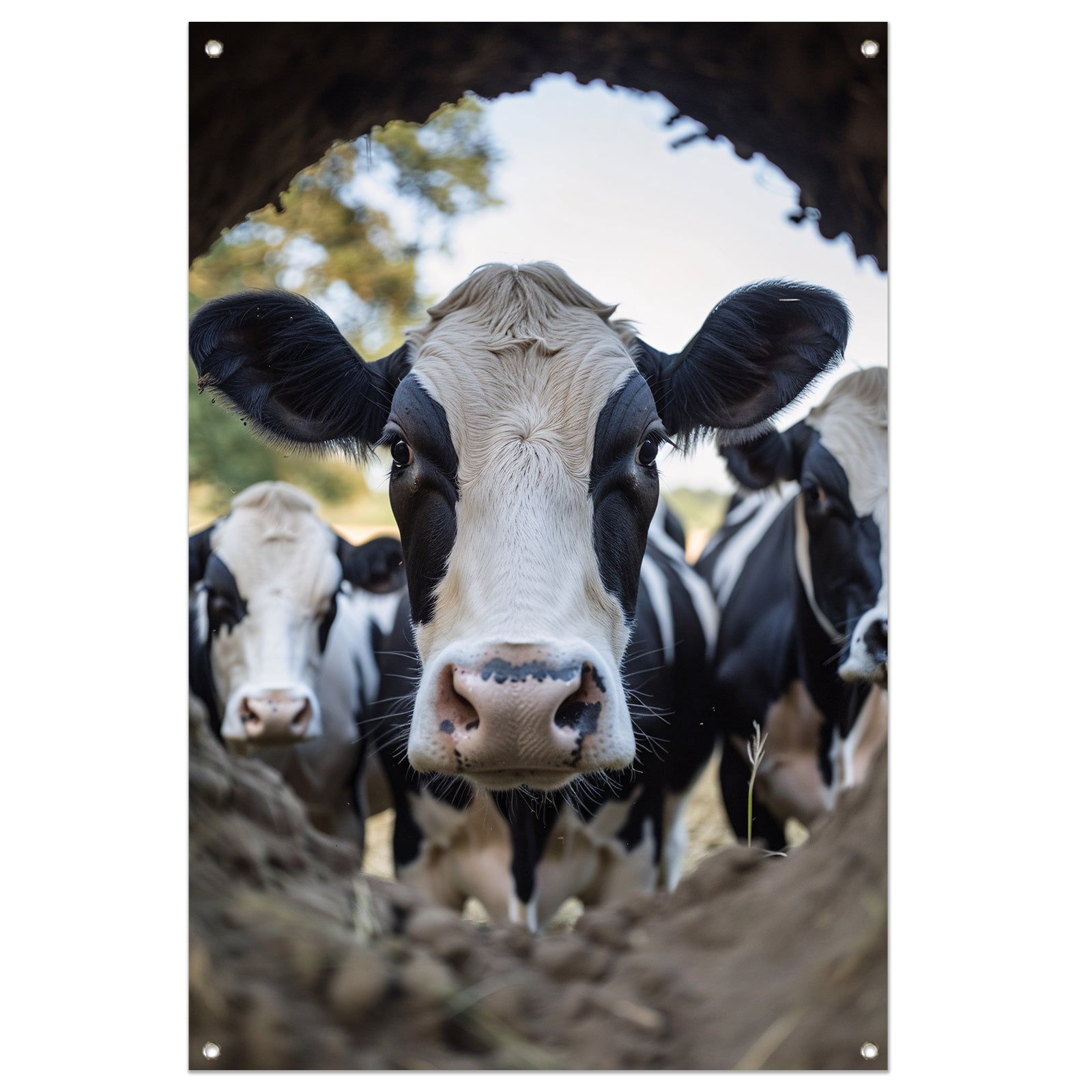 Breng een vleugje plattelandscharme in je tuin met deze unieke tuinposter! De nieuwsgierige zwart-witte koeien kijken recht in de camera, wat zorgt voor een speelse en levendige uitstraling. De foto is genomen vanuit een verrassend perspectief, waardoor het lijkt alsof je zelf in de wei staat.