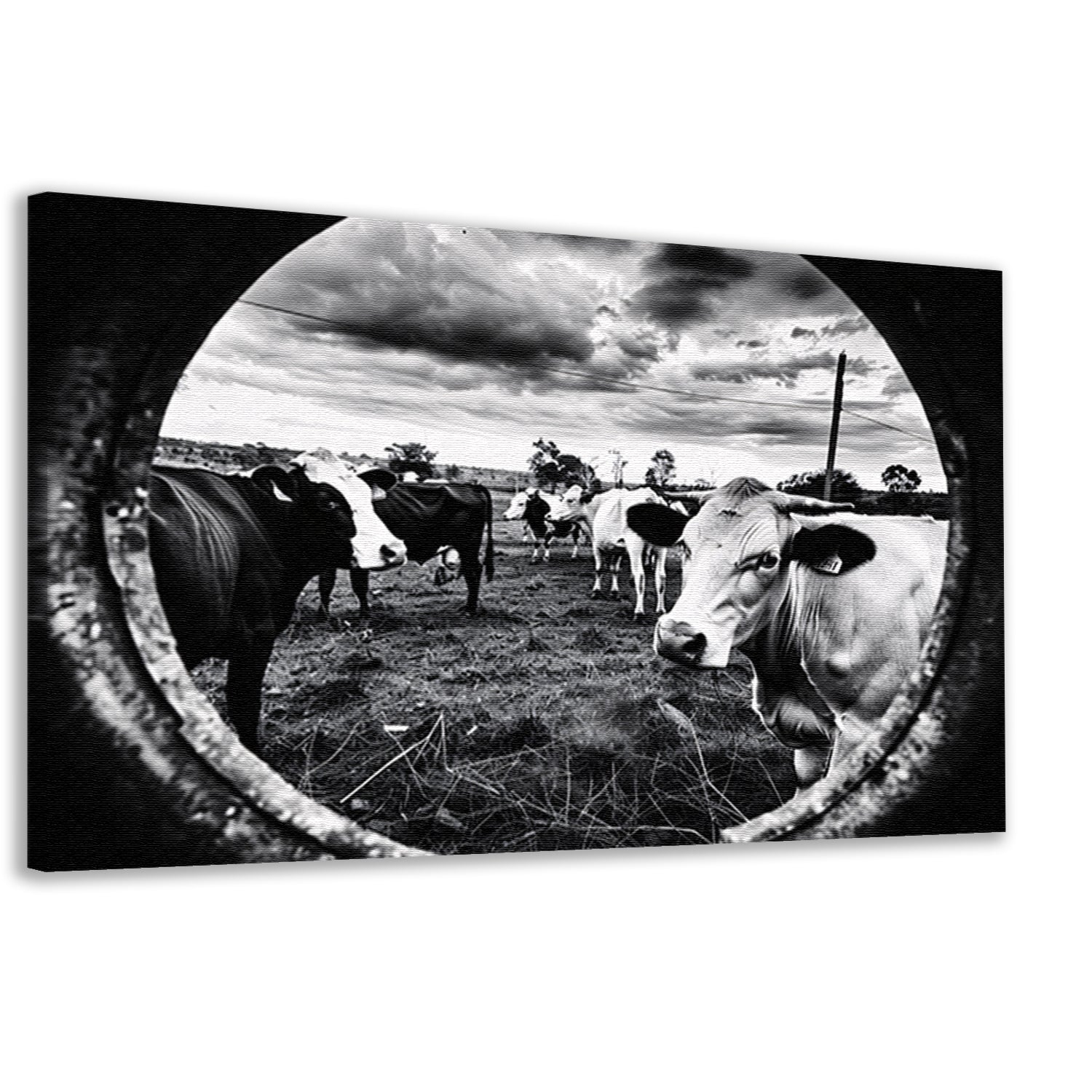 Nieuwsgierige koeien in zwart-wit weiland canvas