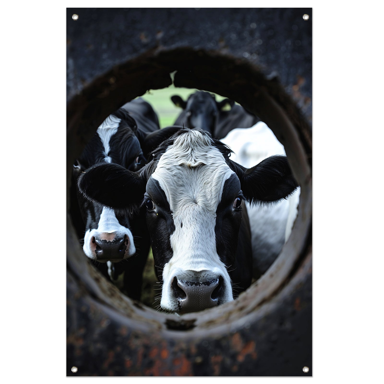 Nieuwsgierige koeien kijken door een wiel tuinposter