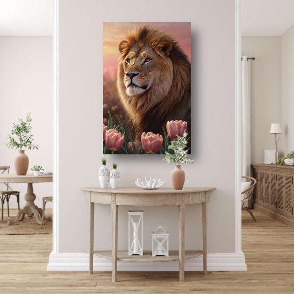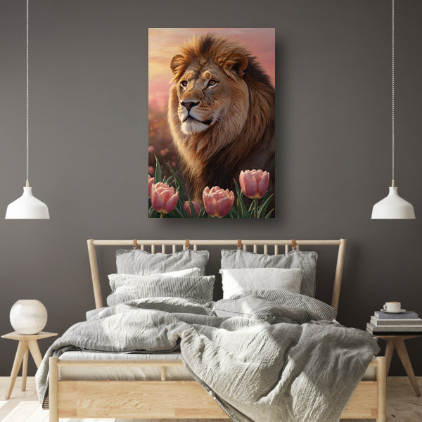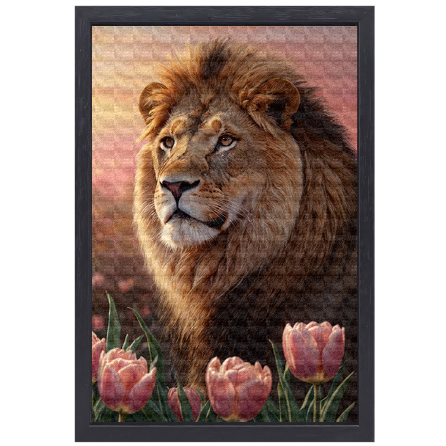 Nobele Leeuw in Tulpenveld bij Zonsondergang canvas met baklijst