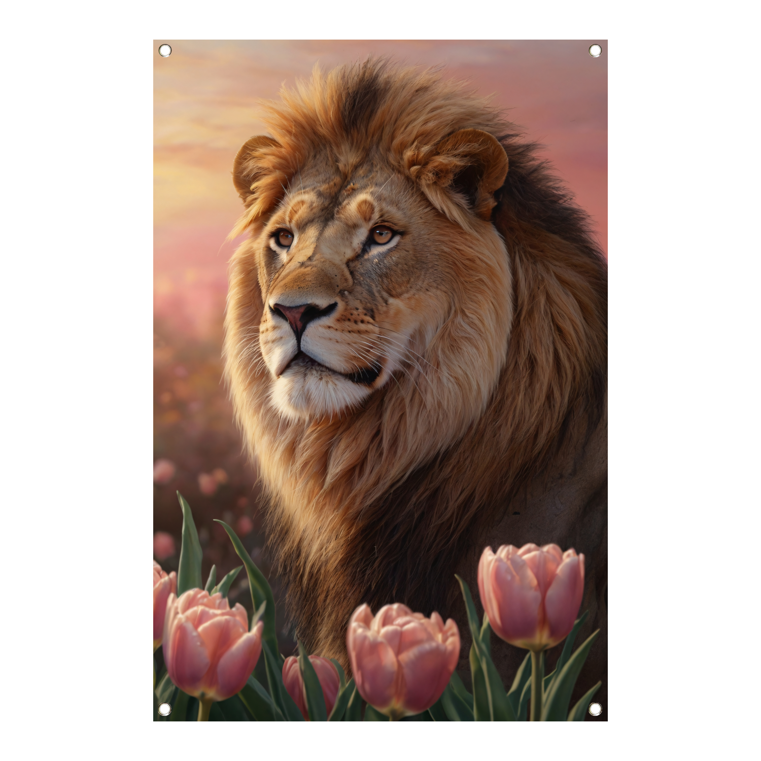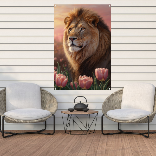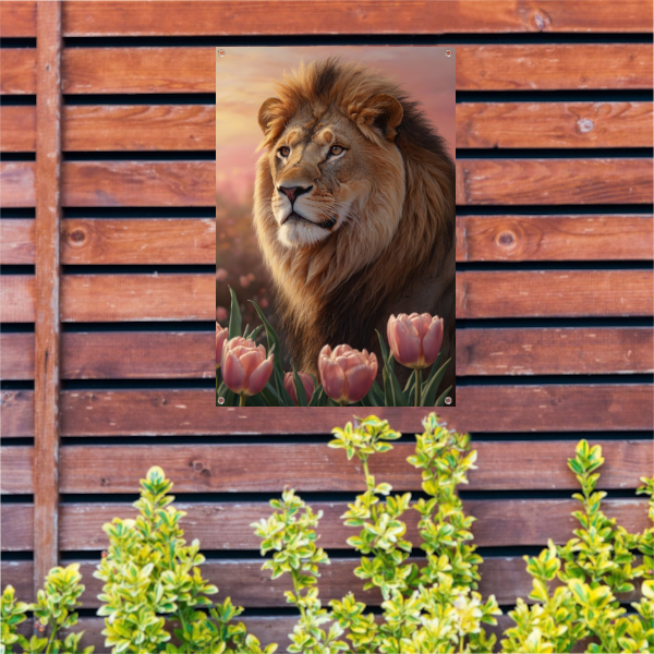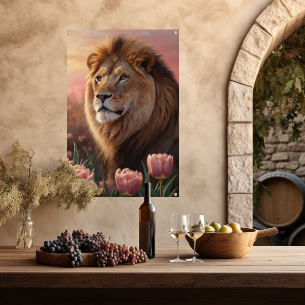 Nobele Leeuw in Tulpenveld bij Zonsondergang tuinposter