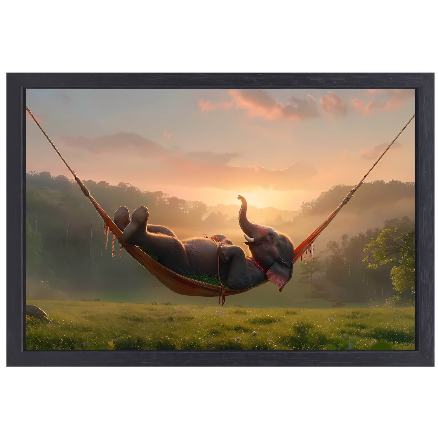 Olifant ontspant in hangmat bij zonsondergang canvas met baklijst