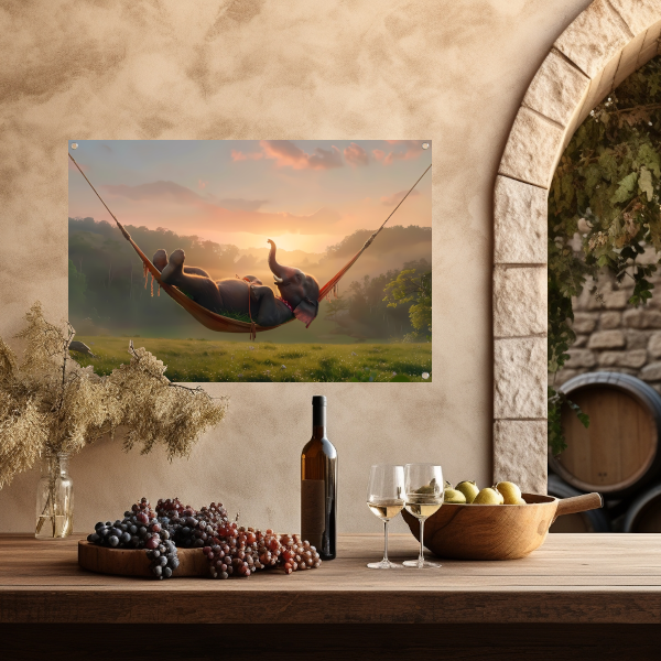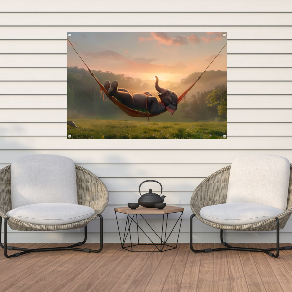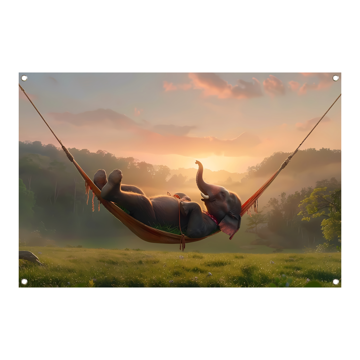 Olifant ontspant in hangmat bij zonsondergang tuinposter