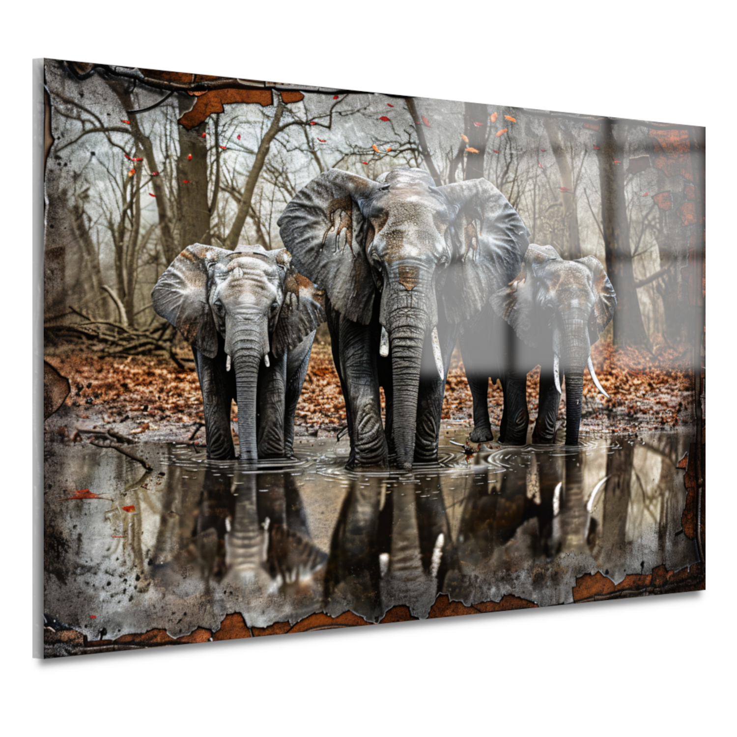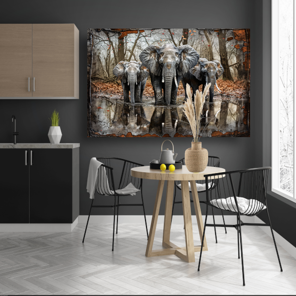 Breng de wonderen van de natuur in huis met deze adembenemende acrylglas wanddecoratie van olifanten met waterreflectie in een boslandschap. Een unieke en stijlvolle toevoeging aan elk interieur!