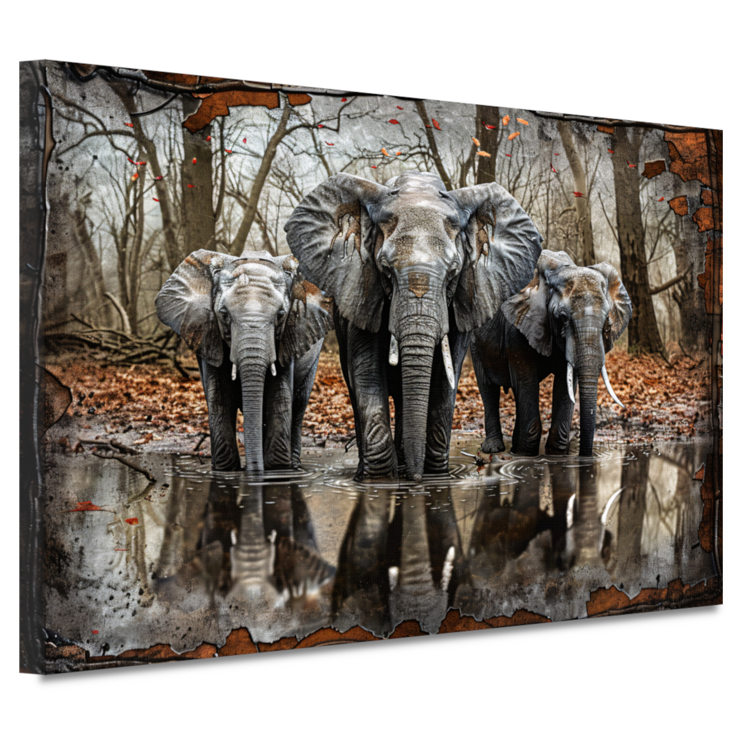 Breng de kracht en wijsheid van de natuur in huis met dit indrukwekkende canvas schilderij. Drie imposante olifanten staan bij het water, omgeven door een herfstachtig bos en een mysterieuze, bijna surrealistische sfeer.