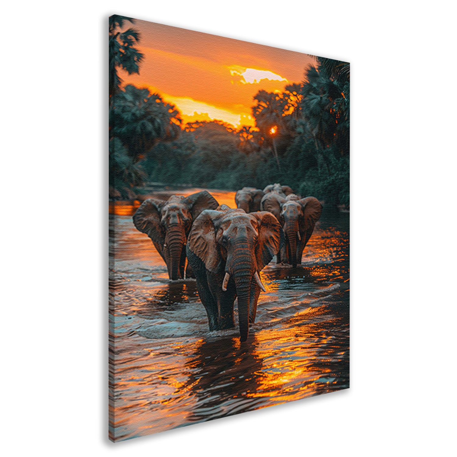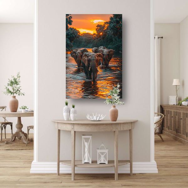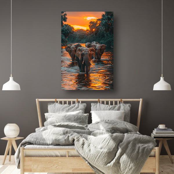 Olifantenfamilie steekt rivier over bij zonsondergang canvas