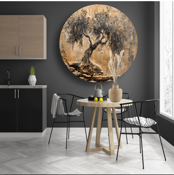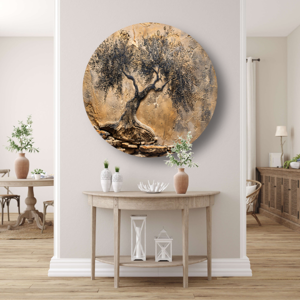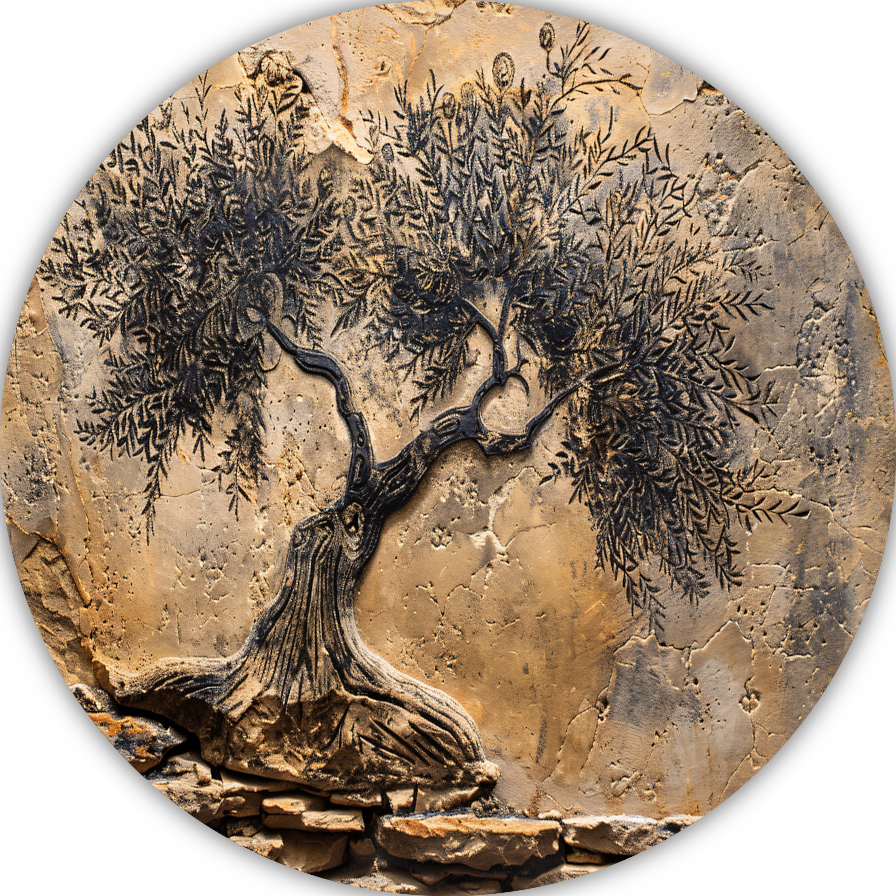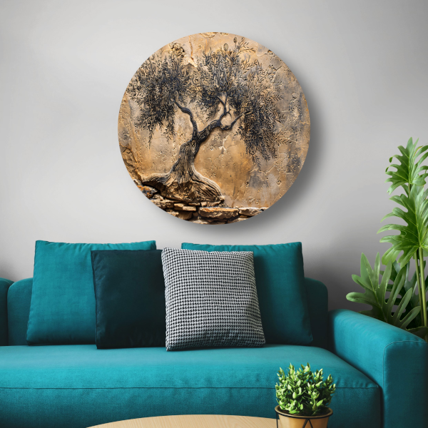 Olijfboom in sepia tonen op steen aluminium muurcirkel
