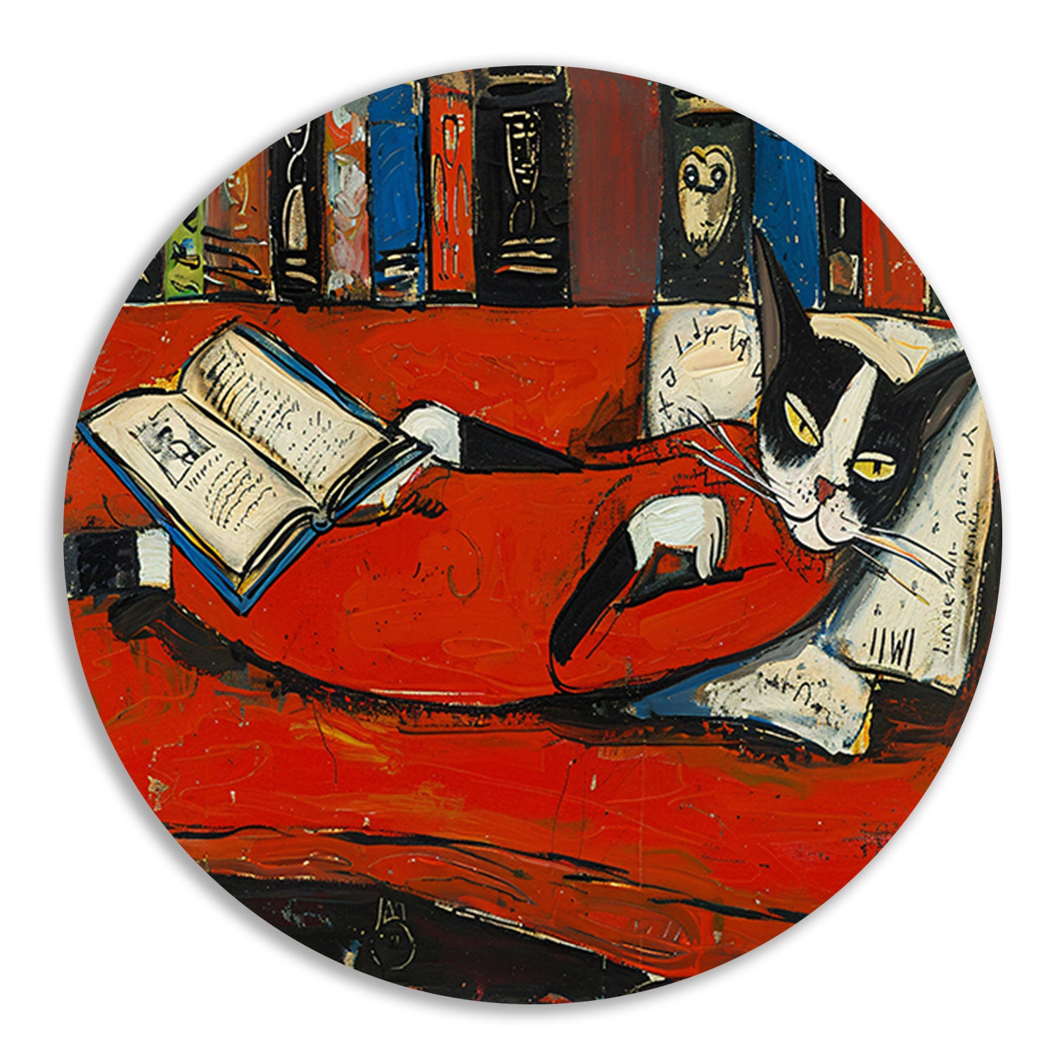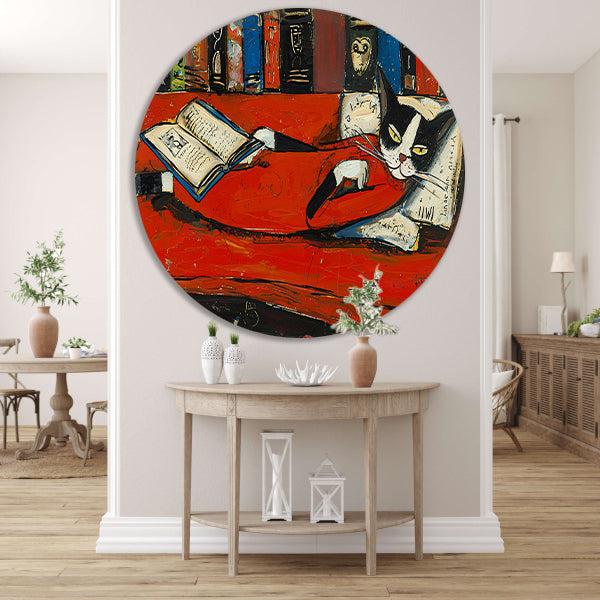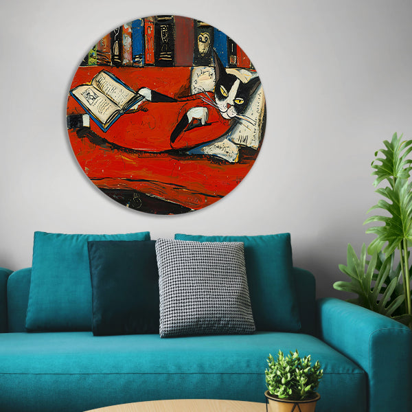 Ontspannen kat op bank met boek aluminium muurcirkel