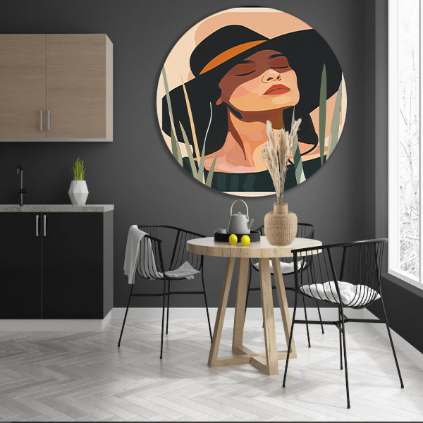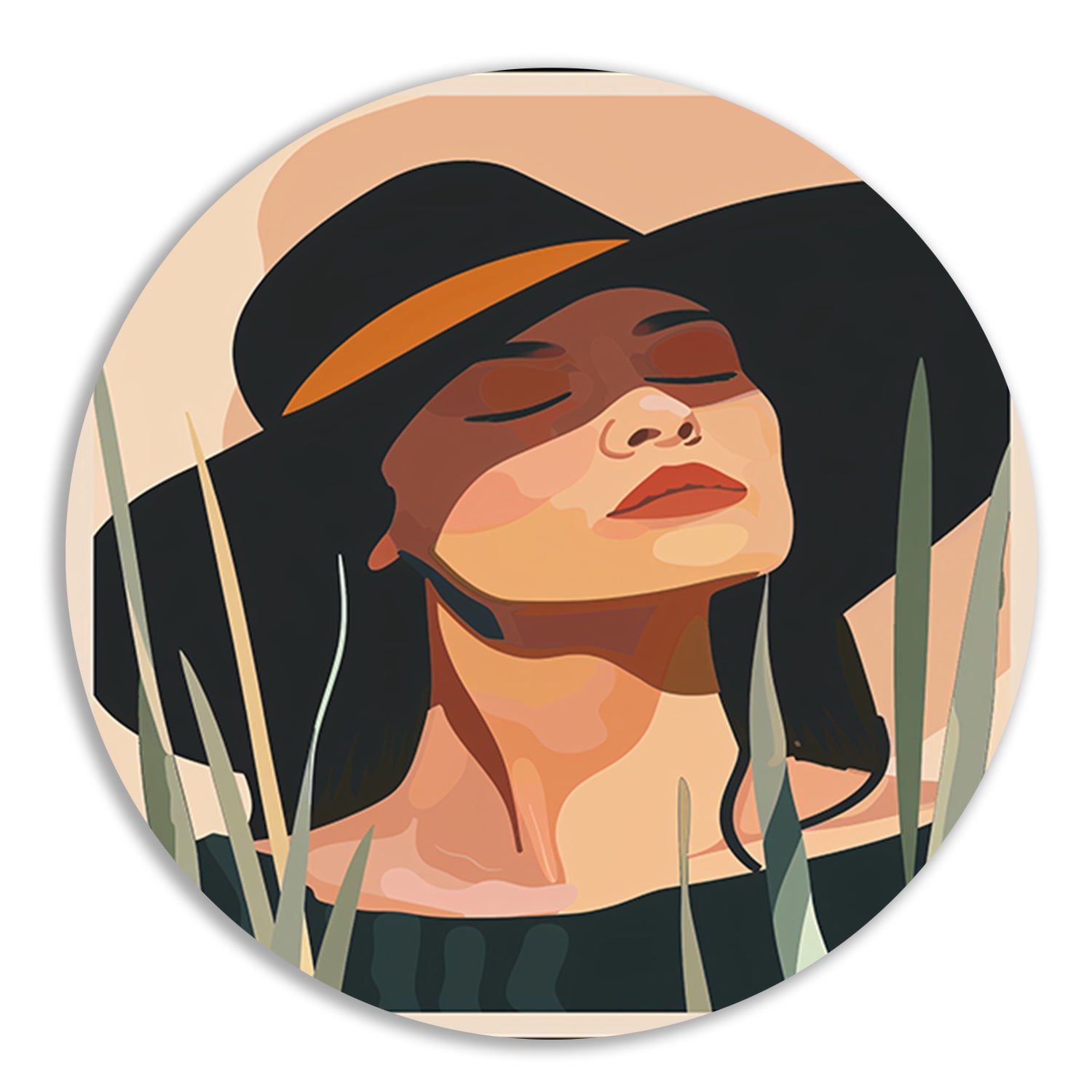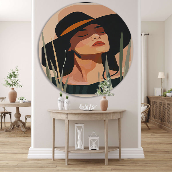 Ontspannen vrouw met hoed onder zon aluminium muurcirkel