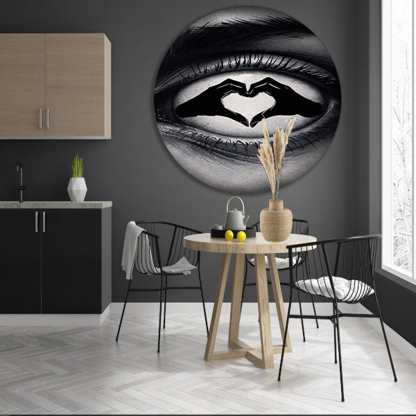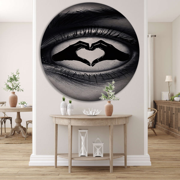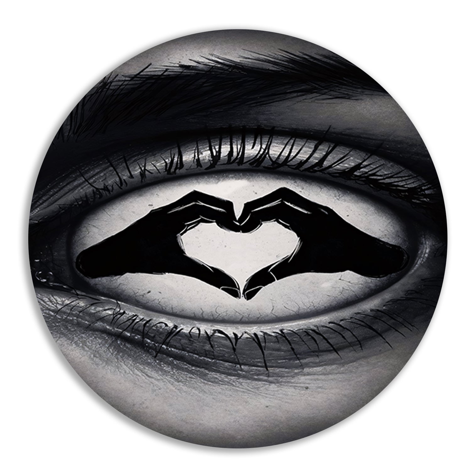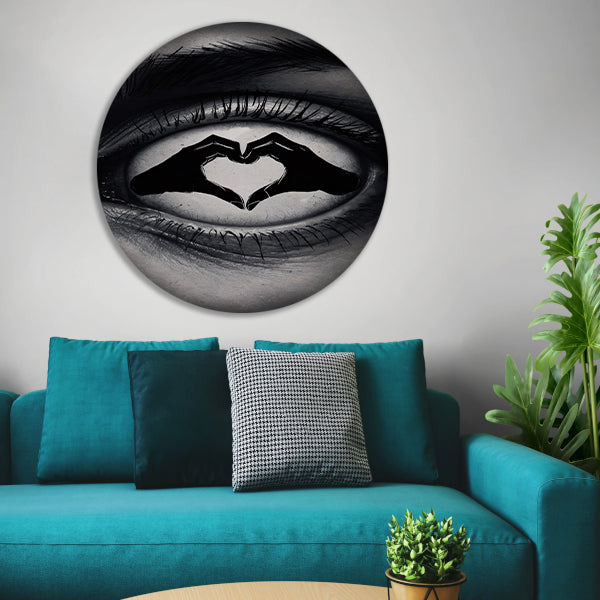 Oog en hartvorm handen in zwart en wit aluminium muurcirkel