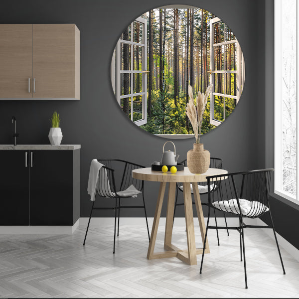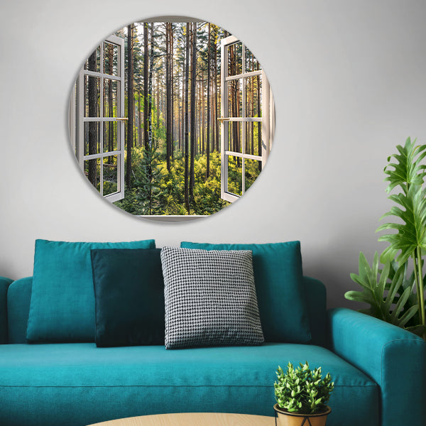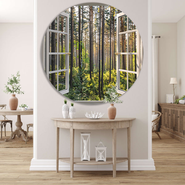 Open raam met uitzicht op een zonovergoten bos aluminium muurcirkel