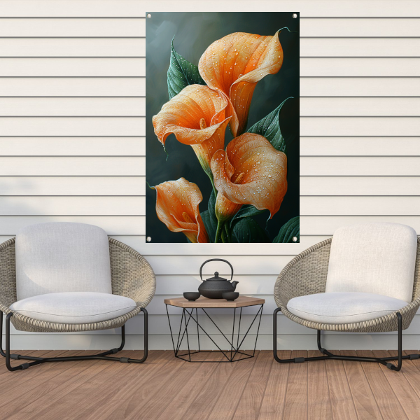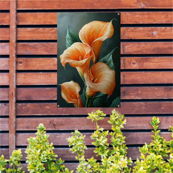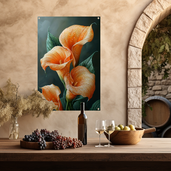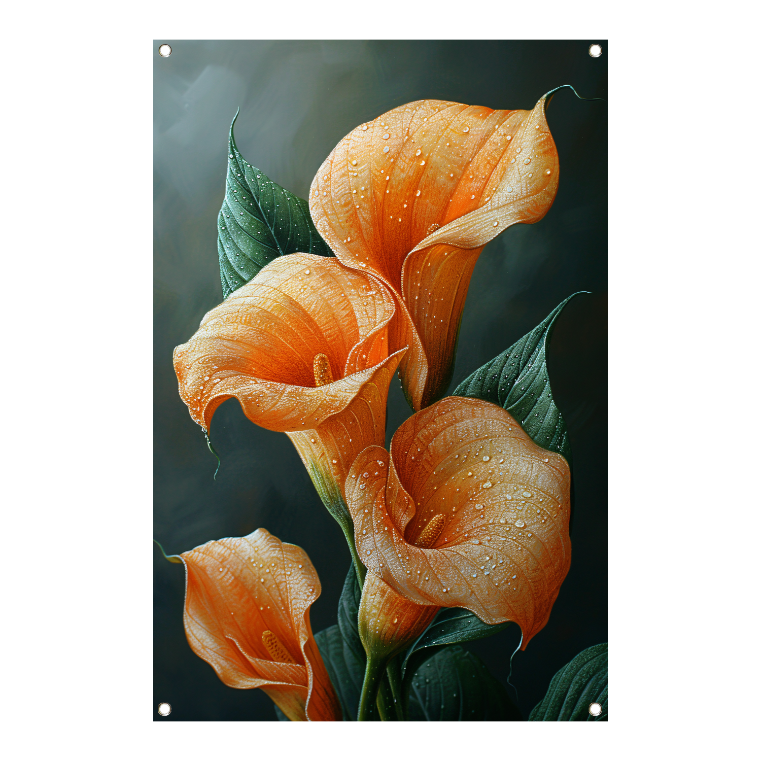 Oranje calla lelies met dauw tegen donkere achtergrond tuinposter