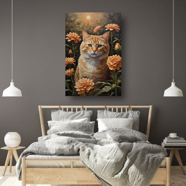 Breng een stukje natuur en vrolijkheid in je interieur met deze prachtige afbeelding van een oranje kat tussen bloeiende goudsbloemen, gedrukt op hoogwaardig acrylglas. Bestel vandaag nog en geniet binnenkort van dit unieke kunstwerk in jouw huis!