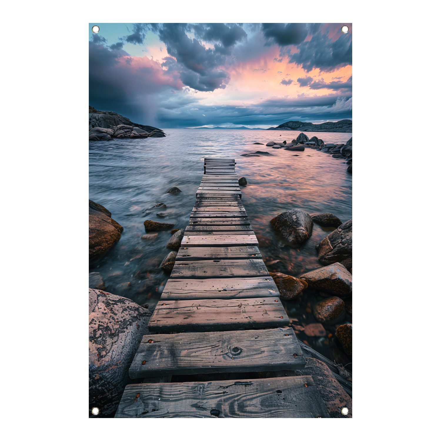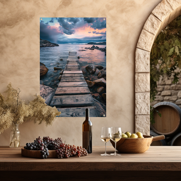 Oude houten steiger leidt naar kalme zee bij zonsondergang tuinposter