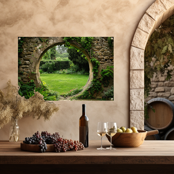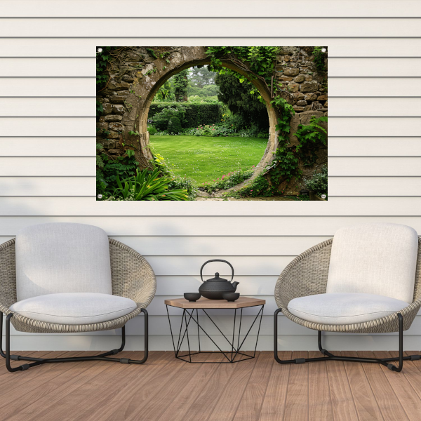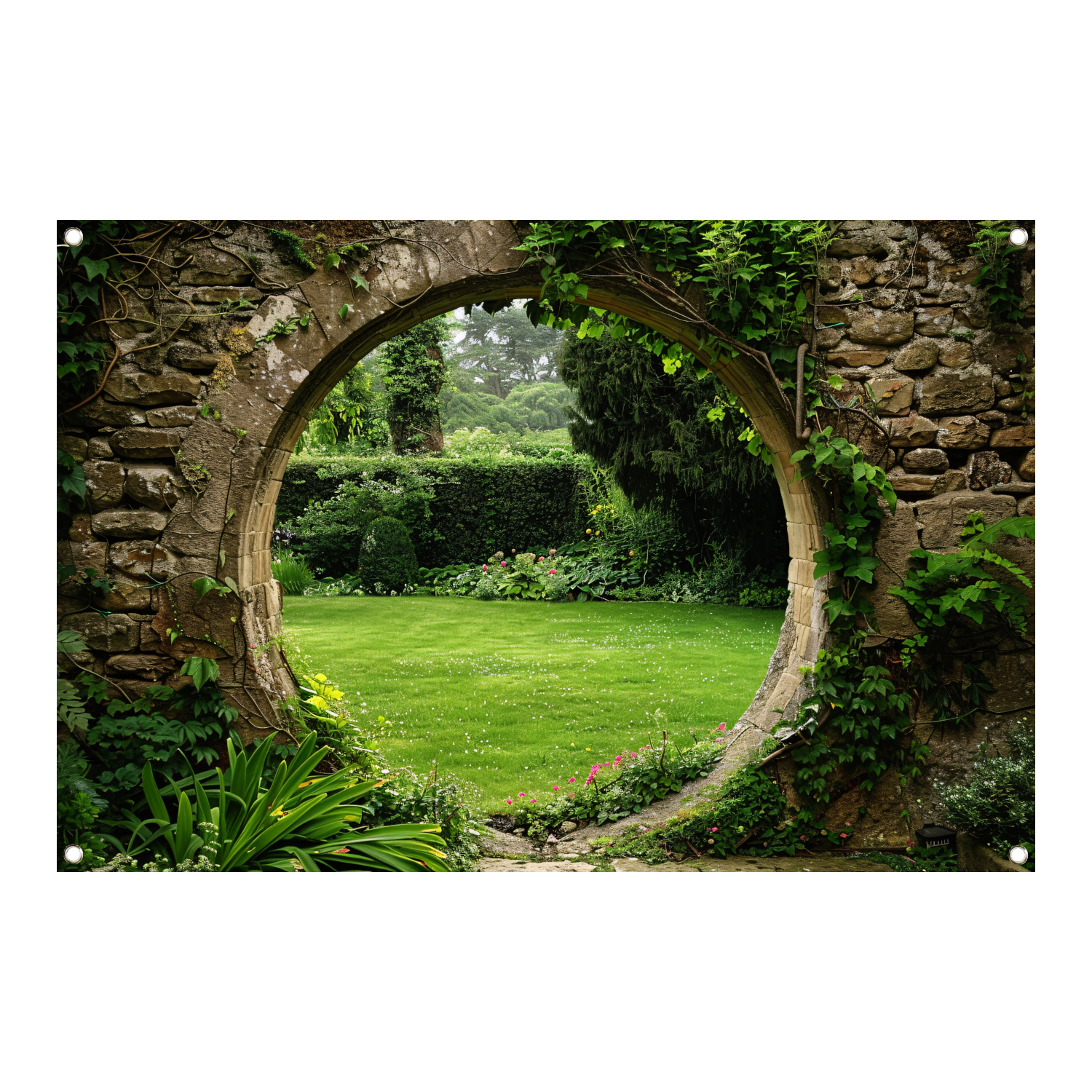 Oude stenen boog met zicht op groene, bloemrijke tuin tuinposter