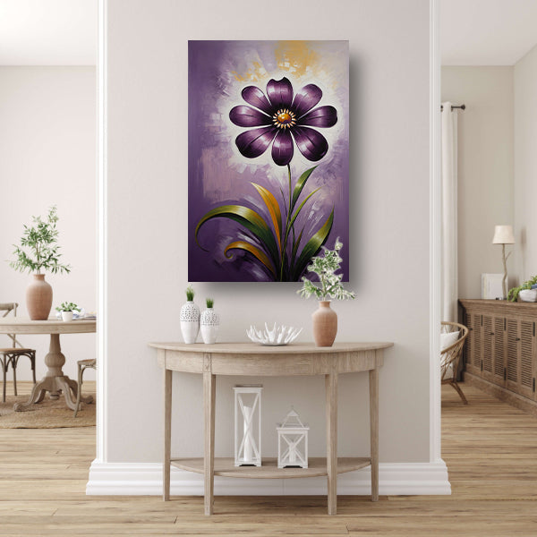 Dit kunstwerk wordt geleverd met een handige ophangplaat, waardoor je het gemakkelijk aan de muur kunt bevestigen. Kies uit verschillende formaten om de perfecte match te vinden voor jouw ruimte. Of je nu op zoek bent naar een eyecatcher voor in de woonkamer, slaapkamer of kantoor, deze paarse bloem impressie zal ongetwijfeld de aandacht trekken en een sfeervolle touch toevoegen.