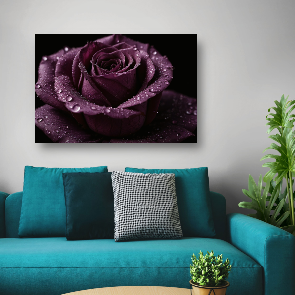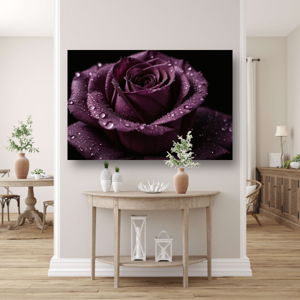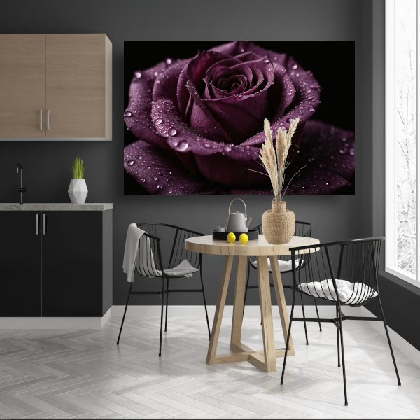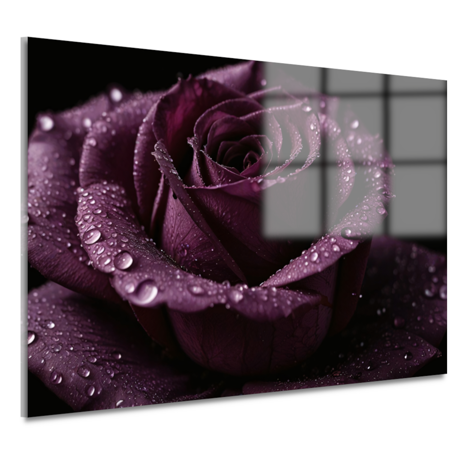 Paarse roos close-up met waterdruppels acrylglas