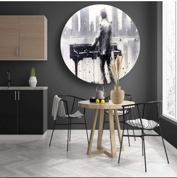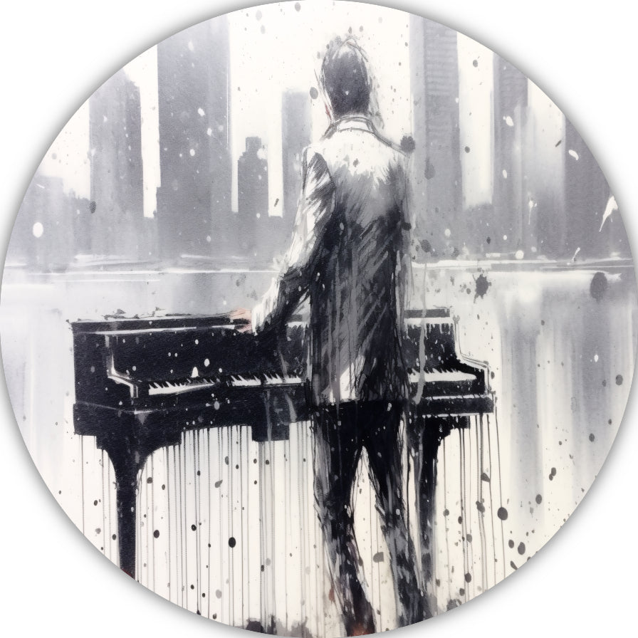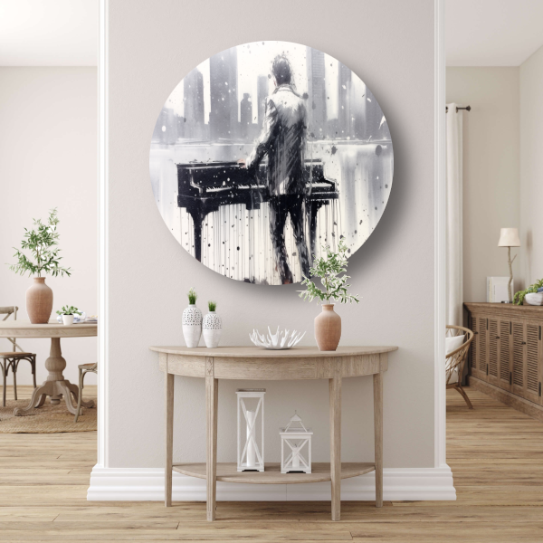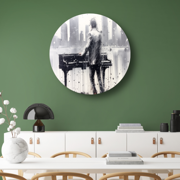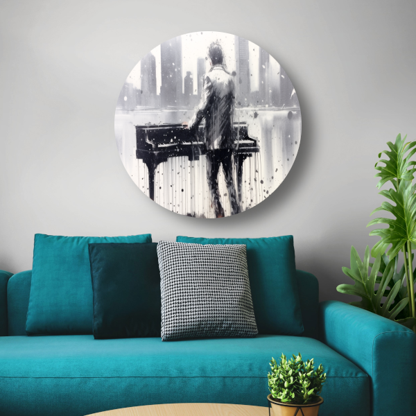 Pianist tegen de achtergrond van een wazige stad aluminium muurcirkel