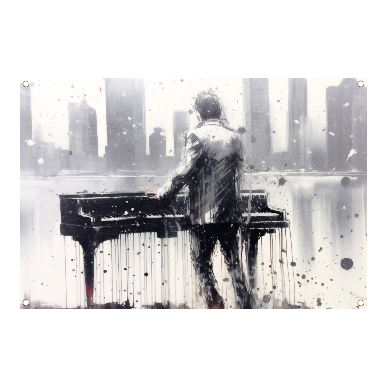 Deze liggende tuinposter is een ware eyecatcher voor in jouw tuin. Het unieke thema van een pianist die speelt tegen de achtergrond van een wazige stad zorgt voor een bijzondere sfeer. De kleuren van de poster zijn subtiel en passen perfect bij de stijl van de afbeelding.