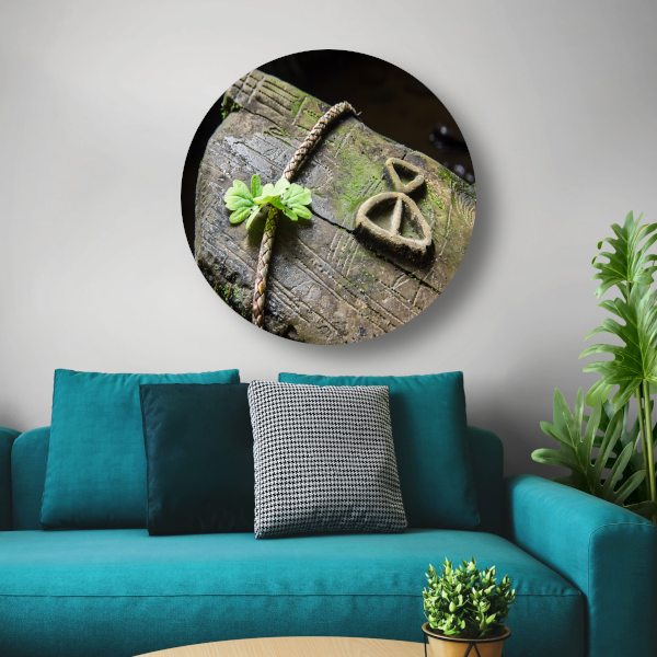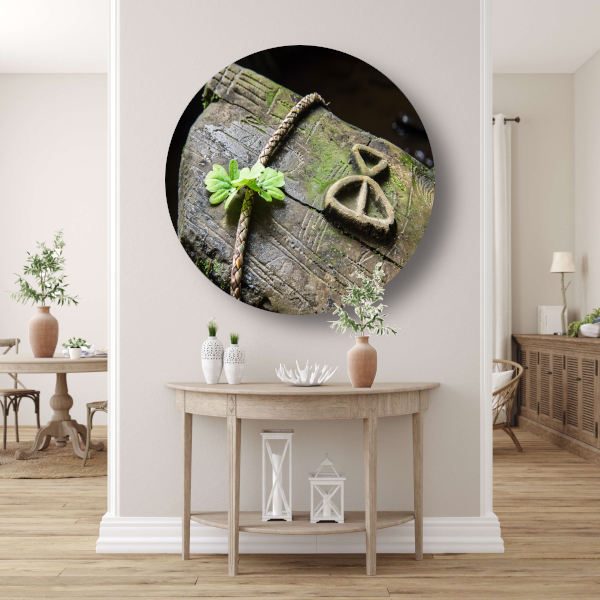Plant groeit uit holle boomstam aluminium muurcirkel
