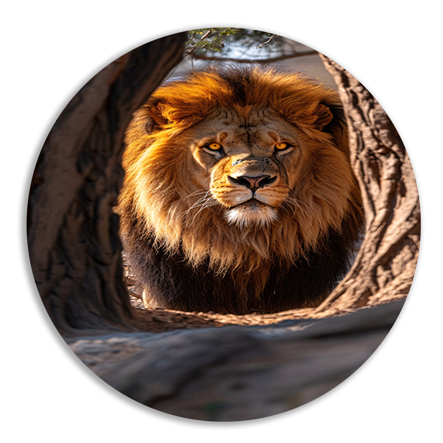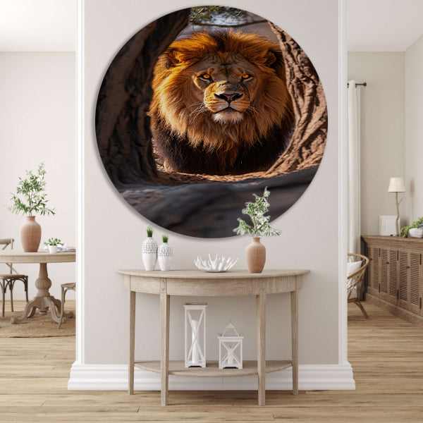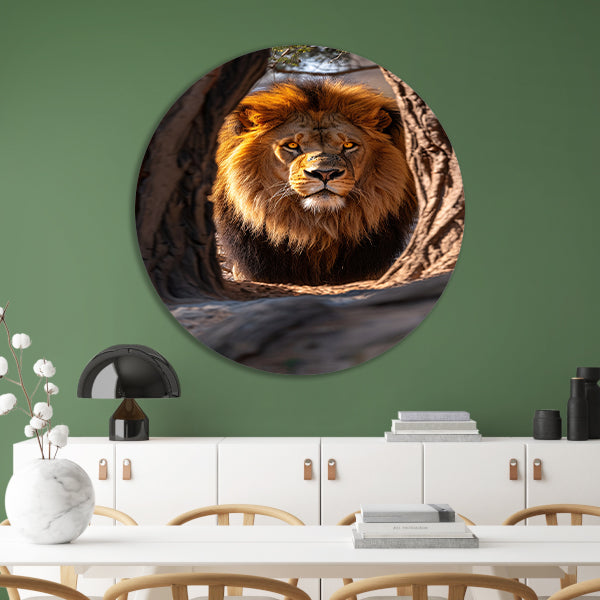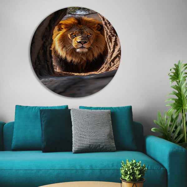 Portret van een Leeuw in een Boom aluminium muurcirkel
