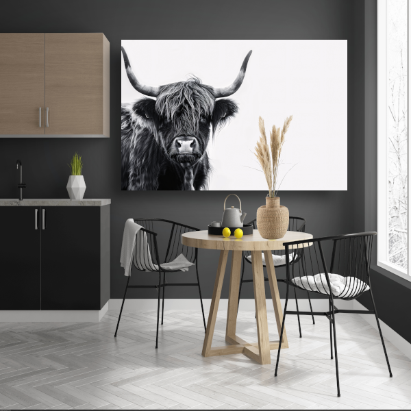 Portret van een Schotse hooglander in zwart-wit canvas met baklijst